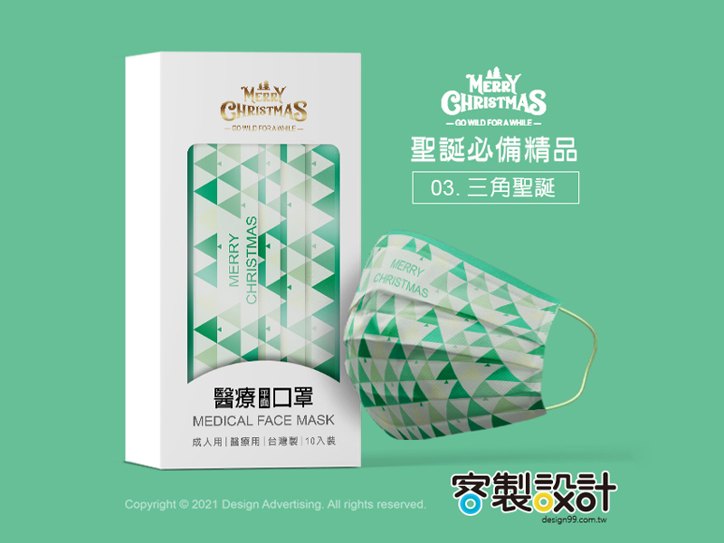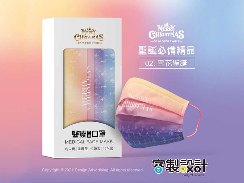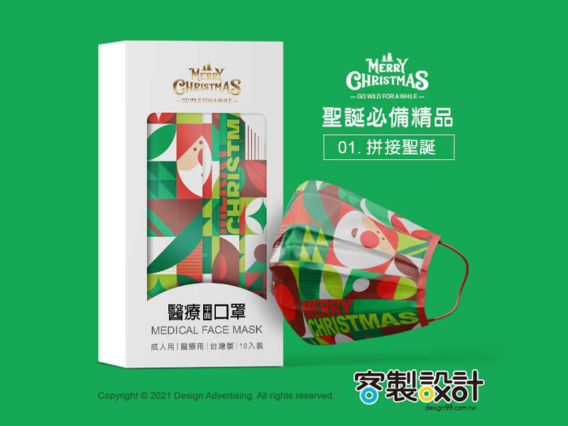 此系列口罩是以聖誕節主題設計,運用幾何圖形和設計元素有律動、漸變、平衡、對稱、和諧…..形成的優美視覺,色彩也應景搭配對比紅綠色呈現強烈個性的聖誕節、有浪漫暖色系漸層呈現唯美雪花星空、也有冷色系走低調不失時尚感的雅痞風格,各種設計都迷人耐看百搭,讓口罩成為時尚穿搭的亮點,希望收到此口罩的親友,可以感受到你滿滿的心意與創意。