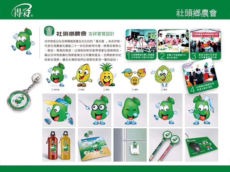 是以佔全鄉種植面積五分之四的「番石榴 」為吉祥物, 代表社頭農會在邁進二十一世紀的新時代裡,將秉持著熱心 、親切、專業的態度,以清新的新形象帶領著社頭鄉鄉民, 藉以吉祥物推廣社頭鄉產業文化和農特產品,並開創新世紀 的新社頭鄉,讓全台灣對我們社頭鄉有更深一層的認知。