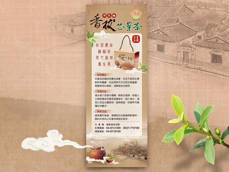 滿泰香拔茶園品牌故事: 滿泰香拔茶園係由現任斗山祠主委所經營,主要係為紀念縣定古蹟蕭氏祖祠~斗山祠第一世祖~滿泰祖而定名。主委任職於農會三十餘年,對農民及農業文化有深厚之情感,退休後仍不忘推廣農業文化,其有感於近年來全民養生意識抬頭,加上食安風波不斷,故致力於香拔芯葉茶之研究,以其三十餘年之農會服務經驗,堅持採用無毒栽培之種植方式,目的除了提供全民一個健康的飲茶文化外,更要為下個世代留下一片純淨的土地。
